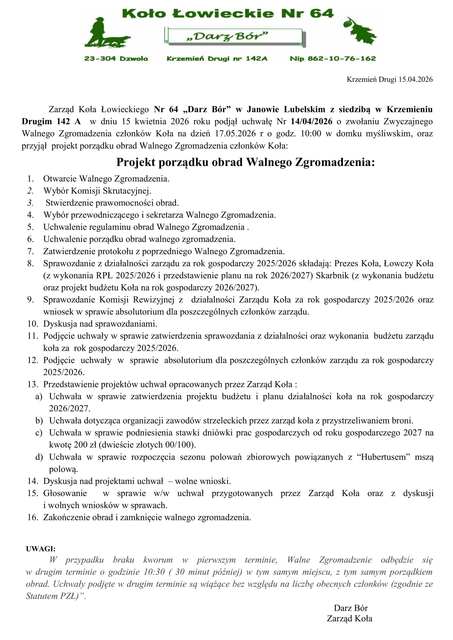 Zarząd Koła Łowieckiego Nr 64 „Darz Bór” w Janowie Lubelskim z siedzibą w Krzemieniu Drugim 142 A w dniu 15 kwietnia 2026 roku podjął uchwałę Nr 14/04/2026 o zwołaniu Zwyczajnego Walnego Zgromadzenia członków Koła na dzień 17.05.2026 r o godz. 10:00 w domku myśliwskim, oraz przyjął projekt porządku obrad Walnego Zgromadzenia członków Koła.